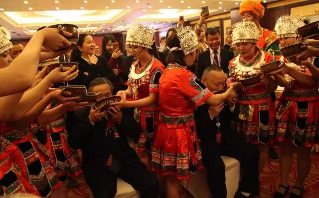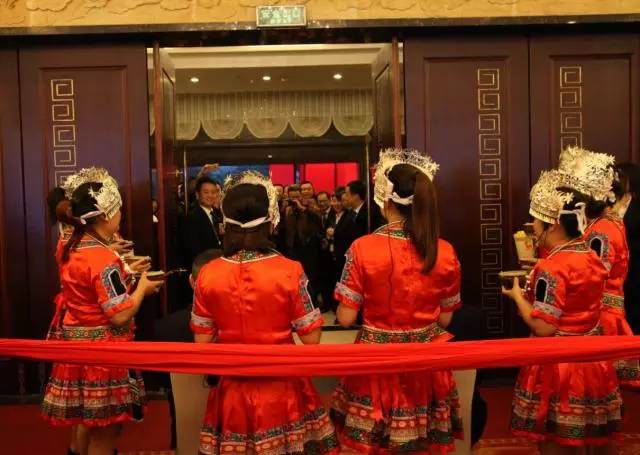 晚宴開(kāi)始前,要喝了攔門(mén)酒,才能進(jìn)入宴會(huì)廳,美麗的侗族姑娘高唱著“阿里哥來(lái)喝酒,你喜歡也要喝,不喜歡也要喝……”這可“為難”了不少英雄好漢。